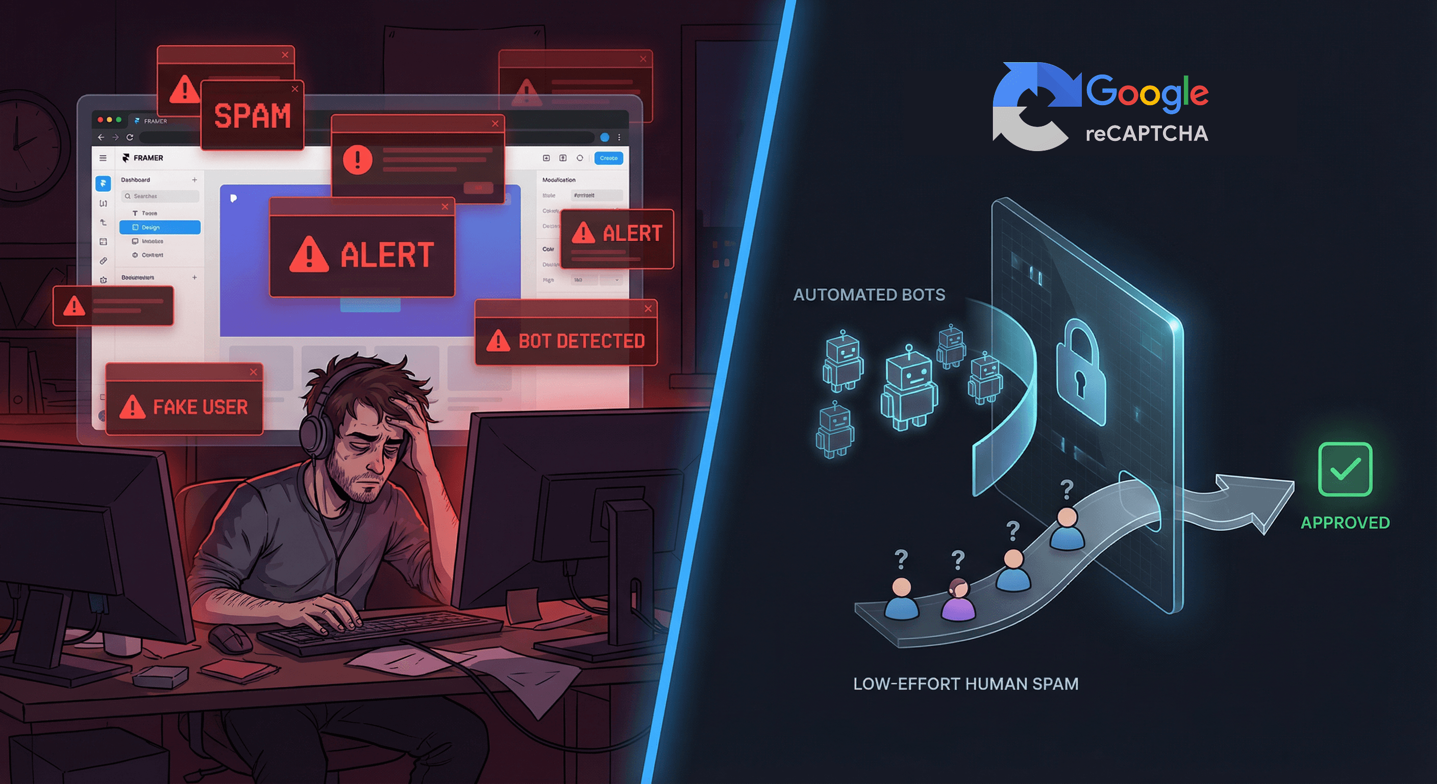 Facing spam emails from Framer forms even with built-in protection? Learn why it happens and how reCAPTCHA v2 helps reduce spam and improve lead quality.